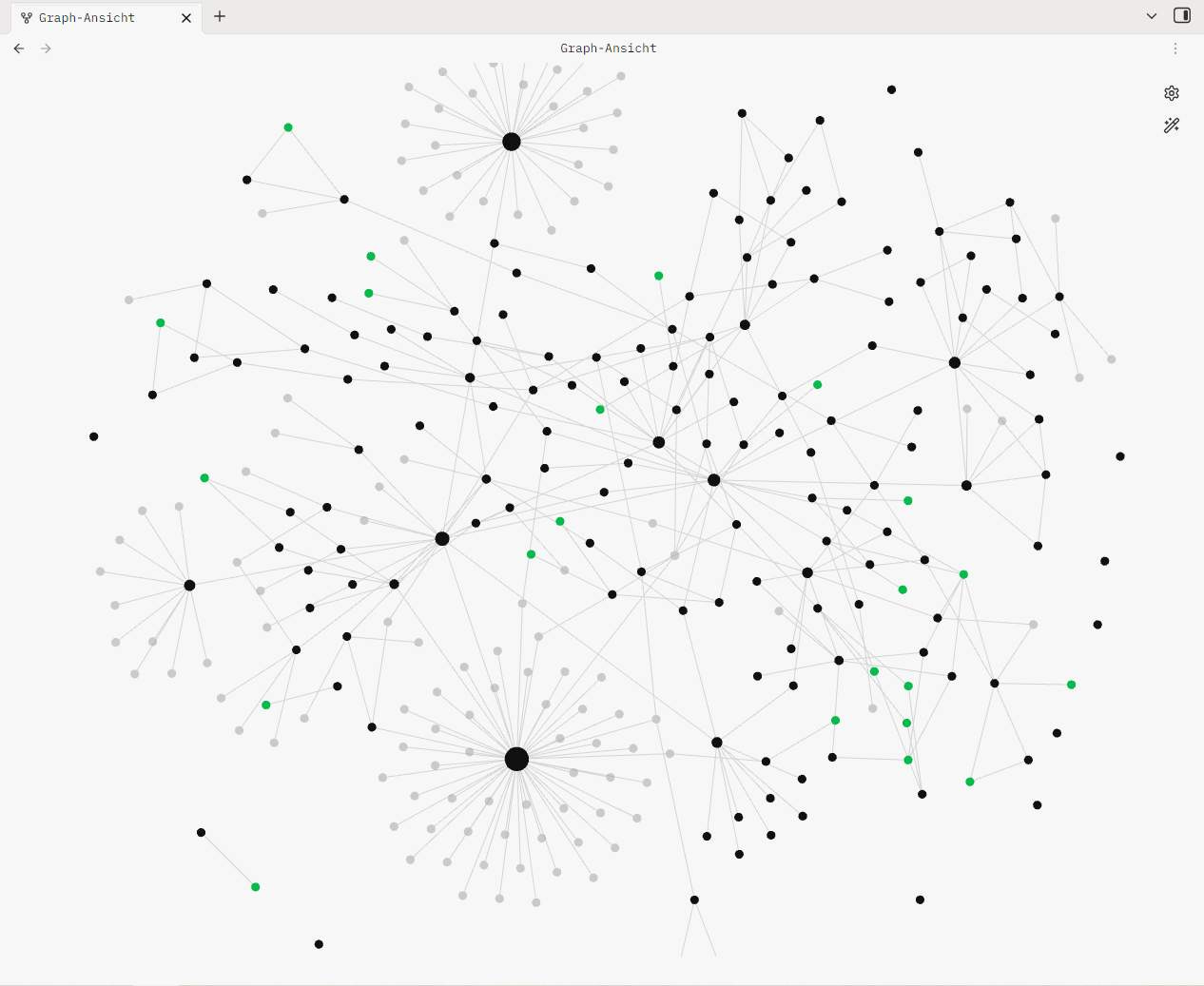 Dieses Netzwerk lässt sich auch in der "Graph-Ansicht" sehr gelungen visualisieren. Notizen werden als "Knoten" und Verknüpfungen als "Linien" dargestellt. Die Größe der Knoten wächst mit der Anzahl der Verlinkungen. Diese Darstellung ist nicht nur ästhetisch ansprechend, sondern hilft dir auch, verborgene Cluster und Verbindungen in deinem Wissensschatz zu erkennen.
